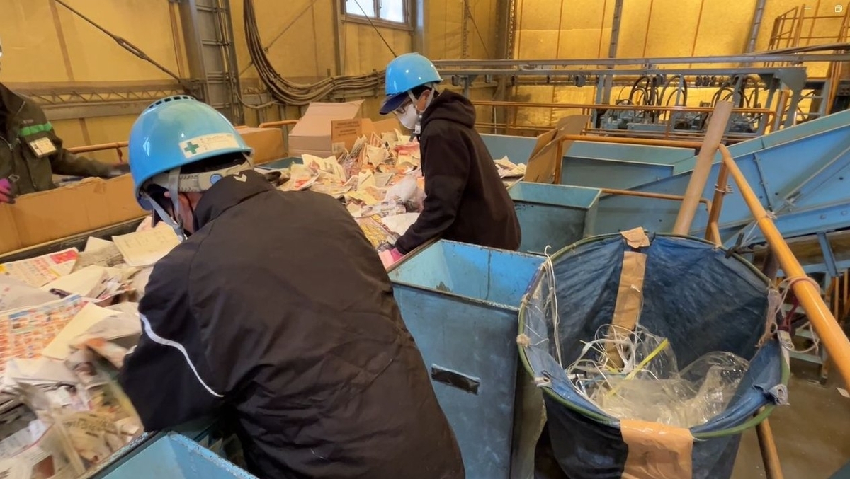 特に新聞類の選別作業では、最初はなかなか古紙が流れてくるタイミングに合わせることが難しいようでしたが、始まって30分もすると機械のスピードに慣れて来て、手が自然に動いてビニールなどの不純物を取り除くことができるようになっていきました。